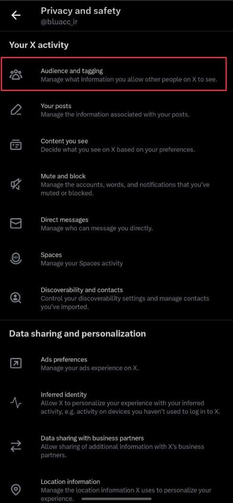 از منوی سمت چپ (در دسکتاپ) یا لیست تنظیمات (در موبایل)، گزینه Privacy and Safety را انتخاب کنید.